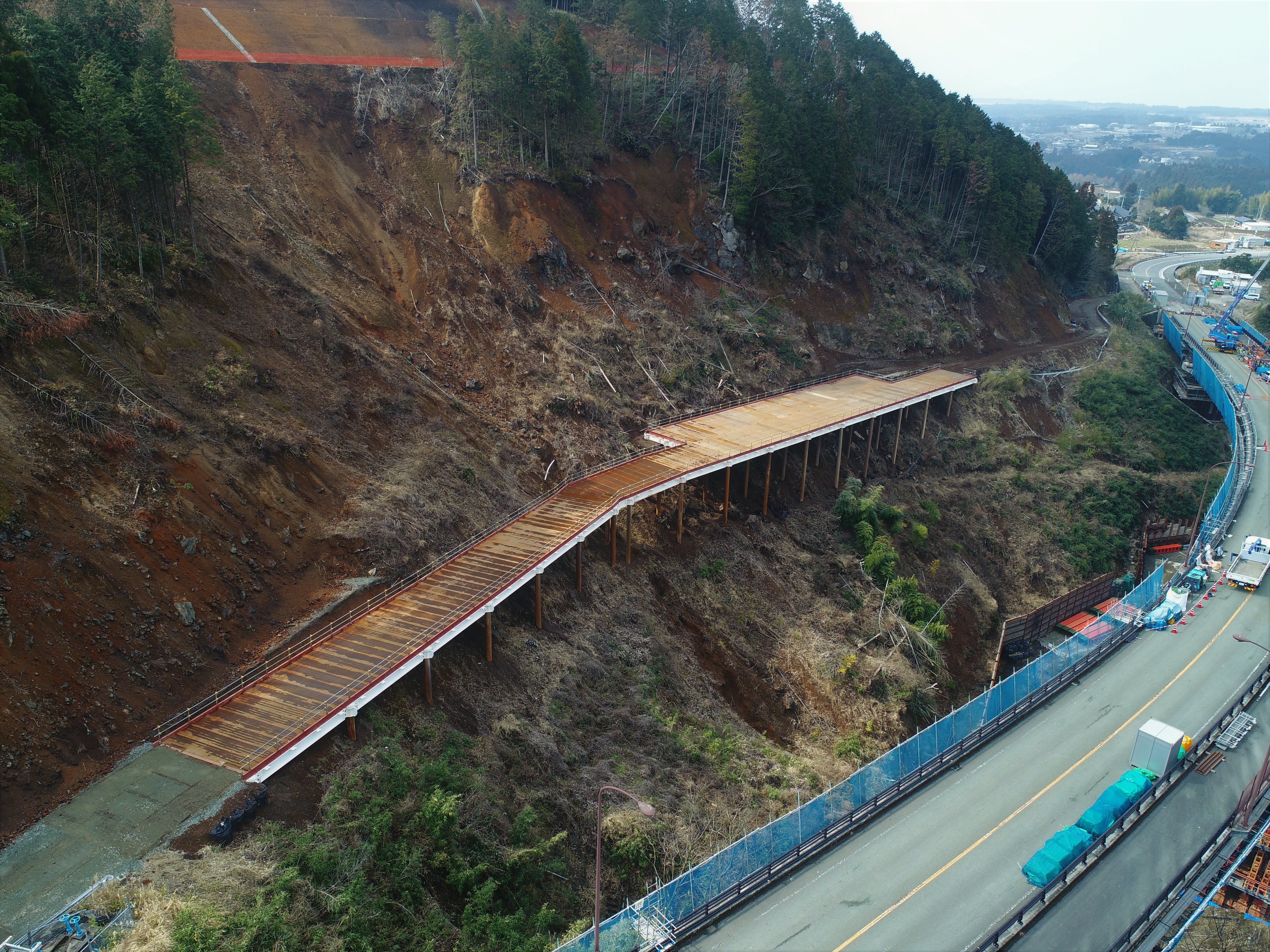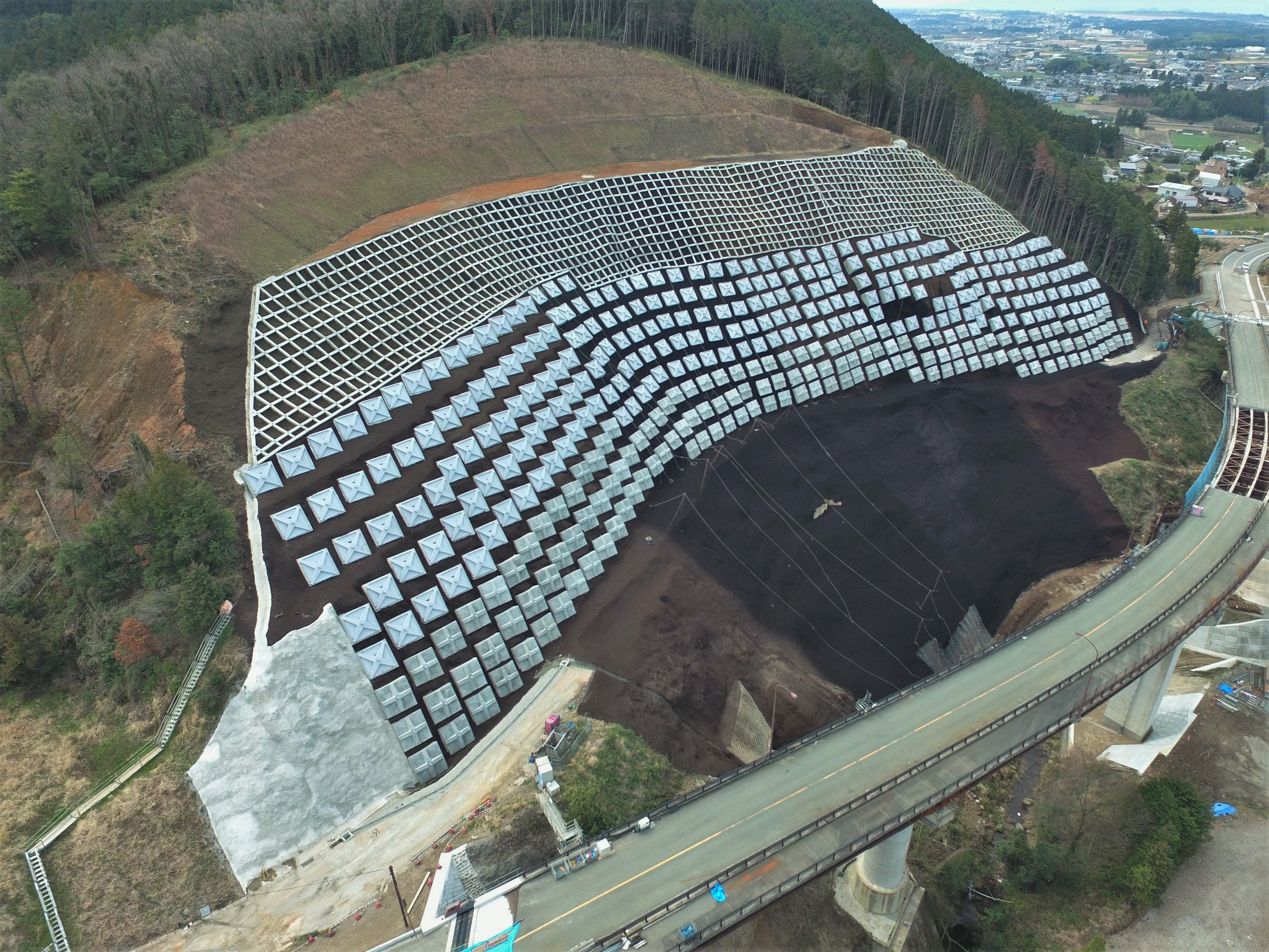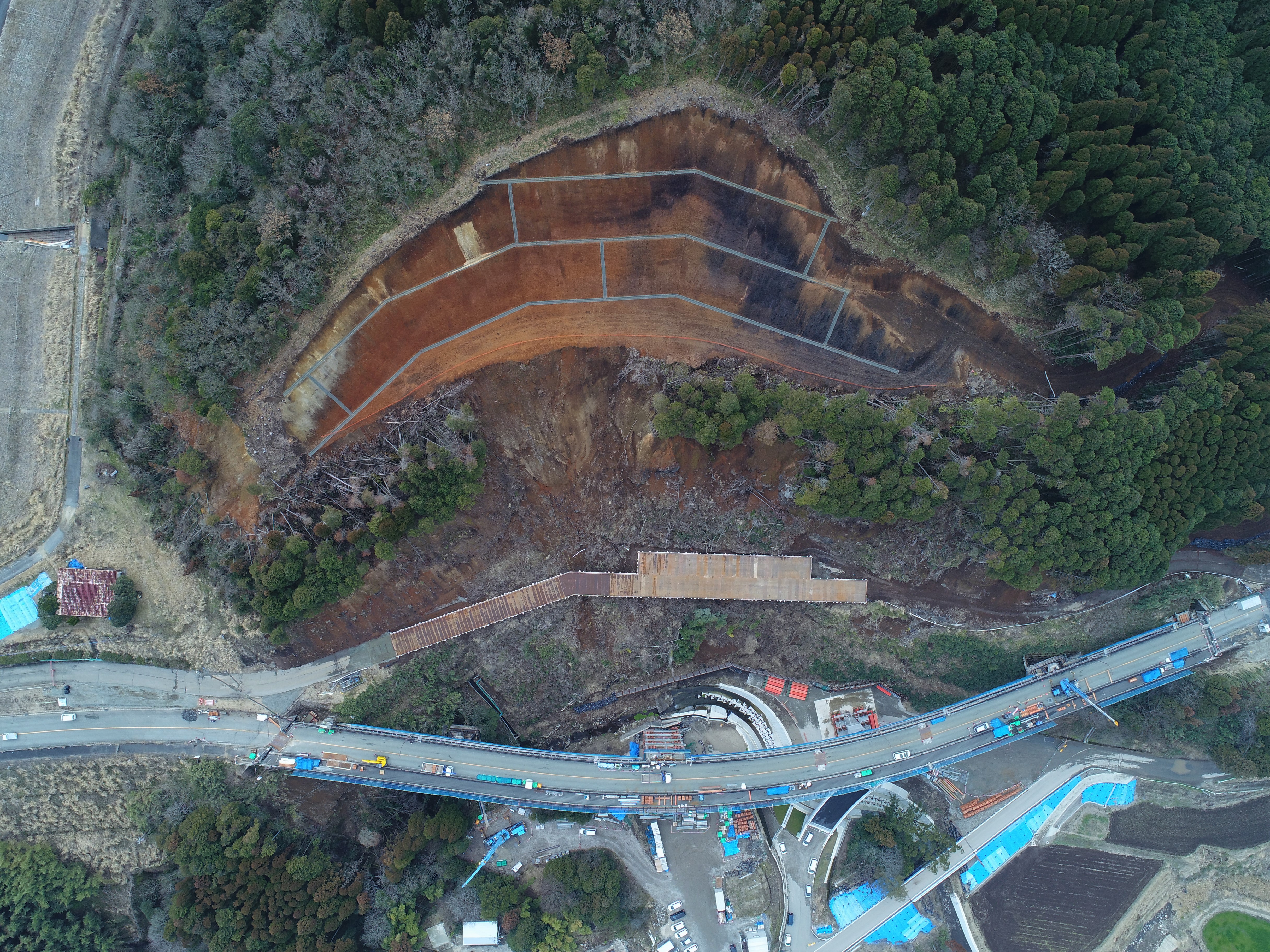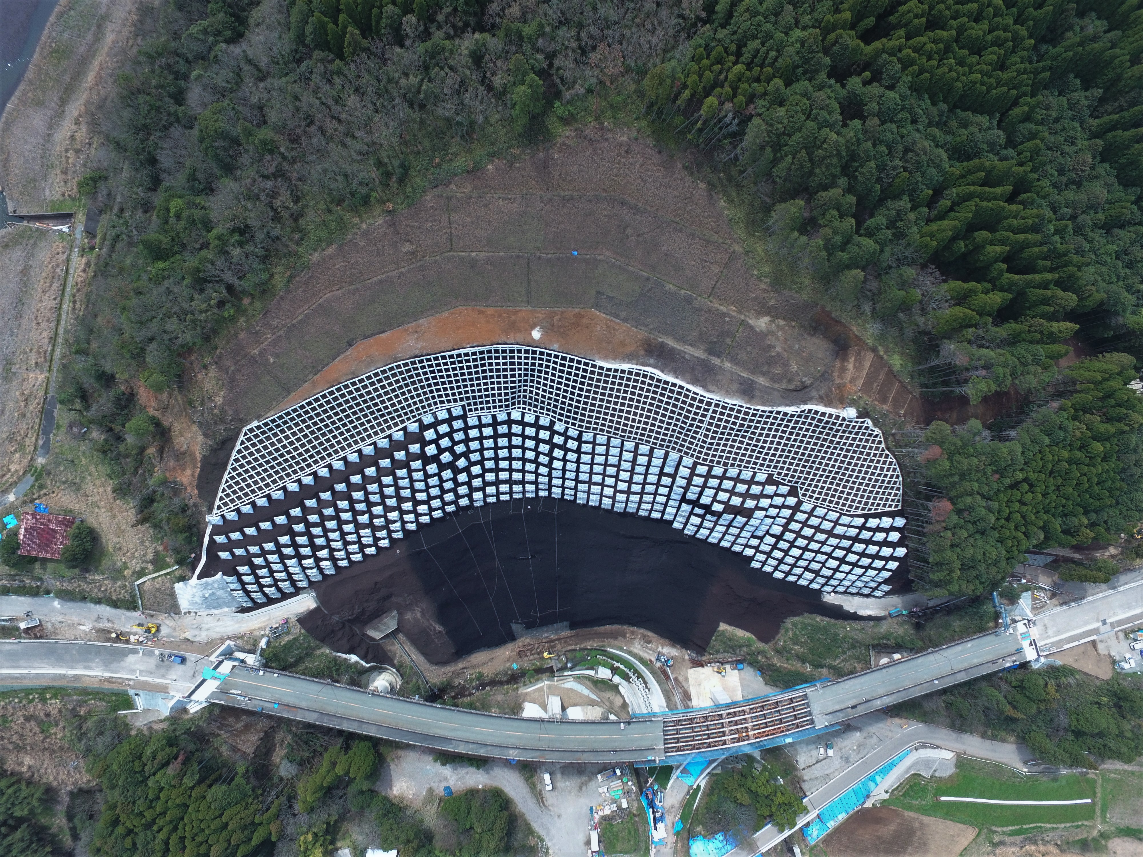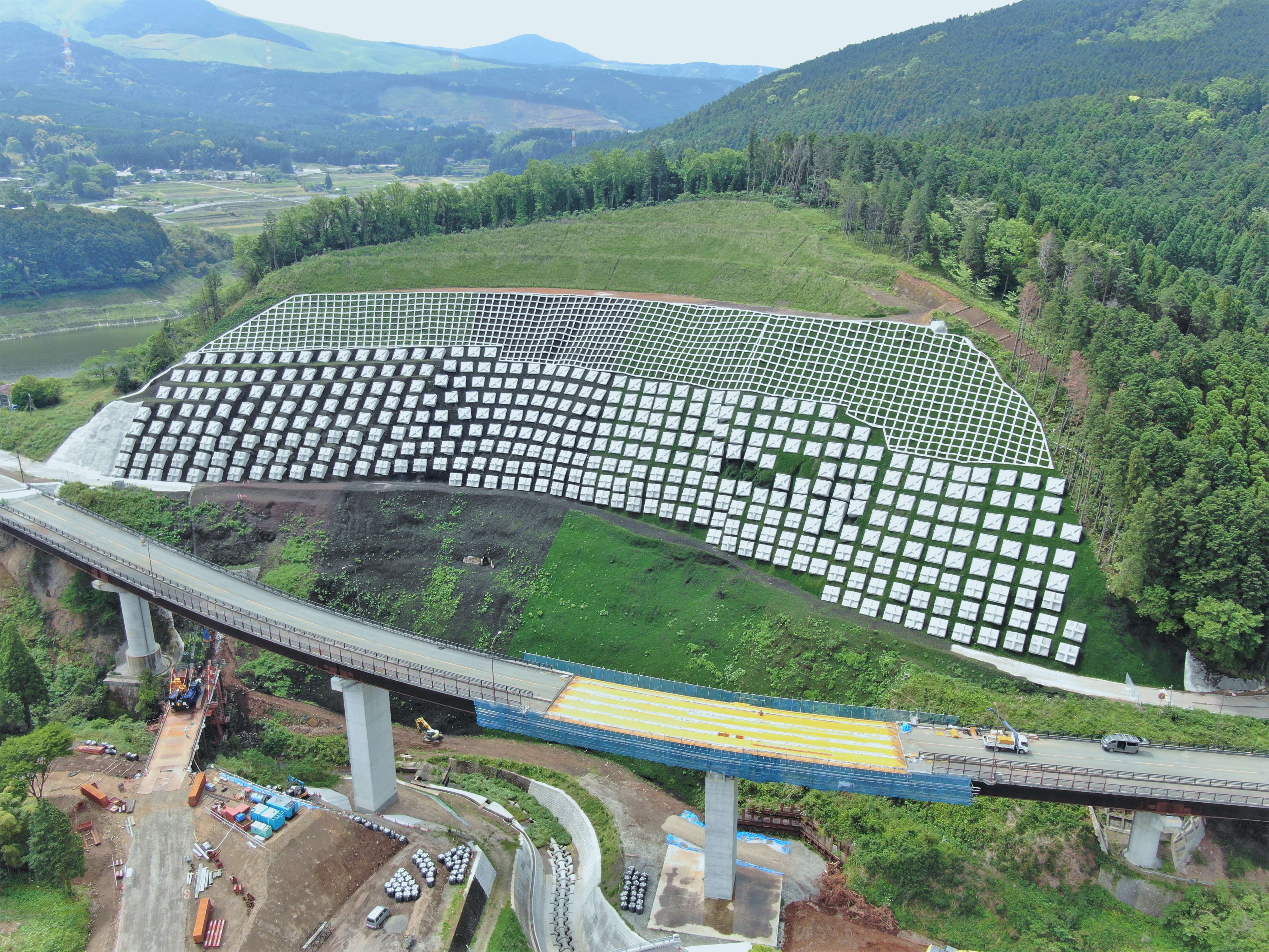 竣工年月:2019年3年 工 事 名:大切畑災害関連緊急地すべり対策(法面その1)工事 工事場所:熊本県阿蘇郡西原村 施工内容:植生基材吹付工T5 6,094m2,植生基材吹付工T4 734m2 現場吹付法枠工 981m,鉄筋挿入工 285本,アンカー工 96本